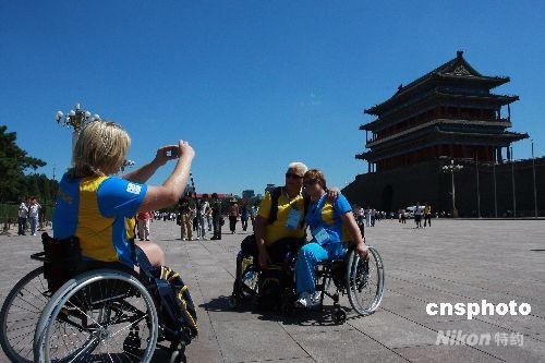 8月31日,北京天安門廣場晴空萬里,一批外國殘奧會代表團成員樂游北京天安門廣場。中新社發 鄭雄增 攝