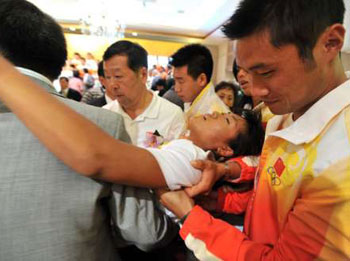 然而,就在這時(shí),站在后排的張楊楊突然出現(xiàn)體力不支,幾乎跌倒,旁邊的運(yùn)動(dòng)員連忙將她扶住。張楊楊用左手摸住額頭,向同伴表示身體不適。乒乓球男單冠軍馬琳與數(shù)名男運(yùn)動(dòng)員和工作人員立即將張楊楊送往休息室。在場(chǎng)的嘉賓都顯得有些錯(cuò)愕。