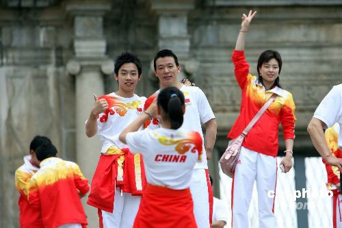圖為國家舉重隊龍清泉、張湘祥等在景點合影。中新社發 洪少葵 攝