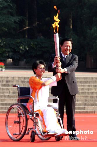 九月二日上午,北京殘奧圣火來到古都南京,受到民眾的熱烈歡迎。圖為江蘇省委書記梁保華將火炬傳遞給火炬手。 中新社發 牛莉 攝
