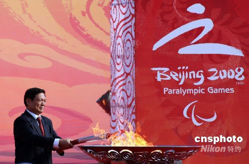 中新網9月5日電 今天上午8時20分許,來自“時代風采線”和“中華文明線”的兩路北京殘奧會圣火匯集中華世紀壇,同時點燃了圣火盆。隨后,殘奧會火炬北京傳遞活動的第一支火炬被燃亮。
