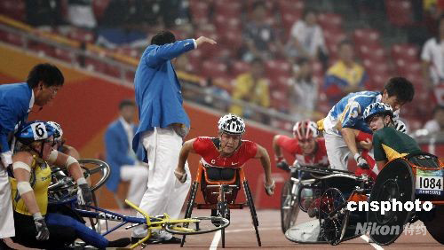 9月8日晚,北京殘奧會田徑比賽女子5000米T54級決賽在北京國家體育場“鳥巢”進行,選手們在比賽中相撞倒地。加拿大選手羅伊以11分54秒03的成績奪冠。圖為加拿大選手羅伊沖出“重圍”。中新社發 盛佳鵬 攝