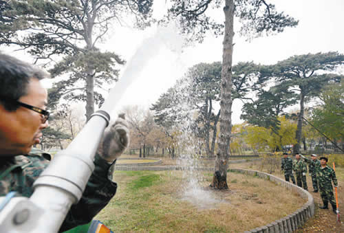 近日,細(xì)心的沈陽市民會發(fā)現(xiàn),工人已經(jīng)開始給沈城大街小巷的樹木刷白——每年入冬時,害蟲都會沿著樹干由上往下爬,爬到地面以下或樹干縫隙當(dāng)中過冬。在距離樹根1米左右的高度,刷上添加了農(nóng)藥和鹽分的石灰水,可以阻斷害蟲逃跑的通道,有效地殺滅害蟲。