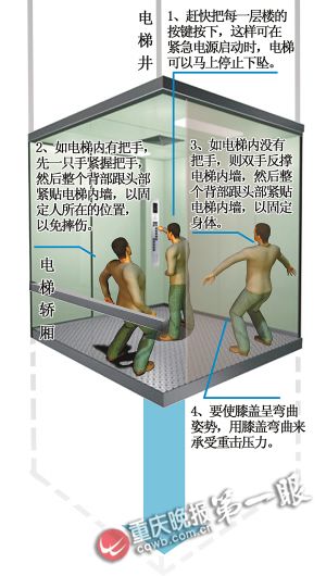 1、保持鎮定,電梯井有防墜安全裝置,會牢牢夾住電梯兩旁的鋼軌,電梯一般不會下墜。
