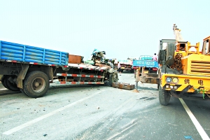 上午8時(shí),記者趕到現(xiàn)場時(shí),飲鹿池橋雙向仍有些擁堵。貨車事故發(fā)生在東向西最內(nèi)側(cè)車道上,一輛吊車正在把從事故車上分離出來的零件吊到其他貨車上運(yùn)走,外側(cè)只有一條車道可供通行。而西向東的撞人現(xiàn)場已基本清理完畢,交通逐漸恢復(fù)。