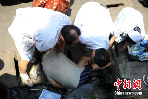 中新網重慶7月30日電(連肖 劉函冉)30日下午14時許,記者路過重慶陳家坪汽車站時看到,一六旬老人倒在車站出站口外的排水溝里。“120”急救人員稱,該老人極有可能是因下空調車后,無法適應室外40多度的高溫,突發心腦血管疾病猝死。