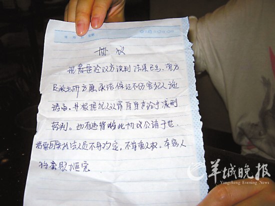 過了半個小時之后,施某提出要吃東西。“他已經三天沒有吃東西,三天來他從沒下過樓,想起來我就心疼。”于是施麗佳下樓買了兩個盒飯帶上去了。“在這段時間,我勸他:警察殺你很簡單,為什么不投案自首呢?如果自首他們會保證你的安全,如果你不放心,我們可以和他們簽一份協議。”施麗佳向記者出示當時協議的草稿,據施麗佳稱,協議的主要內容為施某投案自首,警察保證他的安全,并根據自守的情節向法院求情。