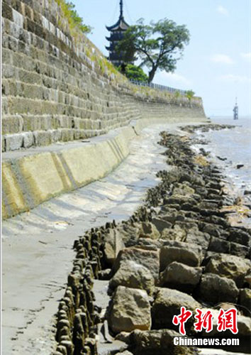 老鹽倉丁字壩是觀看錢塘江回頭潮的寶地,但是隨著錢塘江水位下降,丁字壩竟露出了一米多的堤塘。浙江海寧鹽官觀潮景區(qū)管委會副主任張冰瑜告訴記者,水位已經(jīng)達(dá)到了十年來最低。