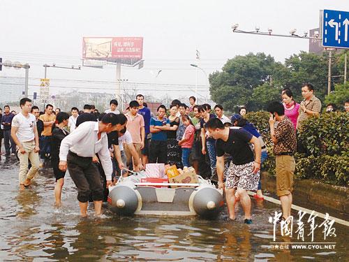 老人坐在充氣的汽車內胎、小孩坐在大塑料盆、婦女坐在木板上被推出去,男人只穿內褲趟水的景象處處可見。各種求救信息,在網絡上傳播。