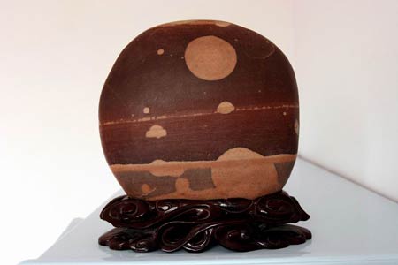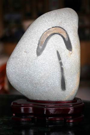 無獨有偶,當日下午1時許,記者在西固區(qū)河口鎮(zhèn)的張先生家中也看到了一塊類似的黃河奇石,不同的是該黃河石的體形稍大,呈淡褐色,黃河石正面上部有一個直徑約4厘米的銀色滿月,滿月的左下方有一顆衛(wèi)星在做繞月飛行,而且繞月軌道清晰可見。張先生告訴記者,大約一年前,他從一位石友處發(fā)現(xiàn)了這塊黃河石,當時覺得挺普通,并沒在意。最近電視、報紙連續(xù)報道“嫦娥”奔月的相關(guān)消息,他突然發(fā)現(xiàn)這塊黃河石頗似衛(wèi)星升空后繞月飛行的場景,便從那位石友處高價購得。(記者 王少丹)