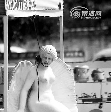 記者趕到現場看到,一個美女雕塑被商家用紅色繩子栓住脖子。少女雕塑臉上好象流露出難受的表情。經過的行人都議論紛紛。城市雕塑是一個城市文明的象征之一,商家不文明的行為,與城市發展非常不和諧。(汪承賢)