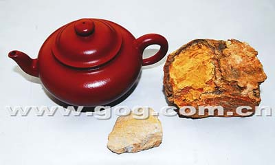 為了證實(shí)此壺真?zhèn),王順發(fā)還專門贈(zèng)送駱先生制壺原礦兩塊(見圖),同時(shí)在收藏證中提到并以此為證。在上?萍汲霭嫔绯霭娴摹蹲仙皦罔b賞寶典》一書中記者看到,圖中大塊的原礦叫石黃心,小塊的叫大紅泥礦,兩者按照一定比例混合則成大紅袍泥,此泥產(chǎn)于宜興市黃龍山,泥質(zhì)細(xì)膩密度大,屬十分稀有泥類,是制宜興紫砂壺頂級(jí)泥料。