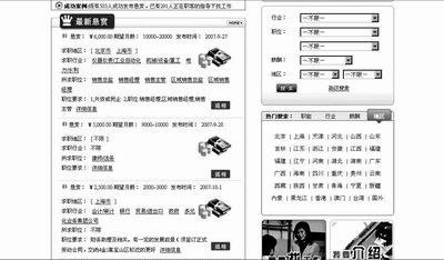 “現(xiàn)有503人成功發(fā)布懸賞,已有291人正在職客的指導下找工作。”打開一家域名為http:///的職客網(wǎng),不斷更新的數(shù)字赫然入目。眾多職客網(wǎng)上,求職“懸賞令”通常被當作“招牌”掛在網(wǎng)站的首頁。