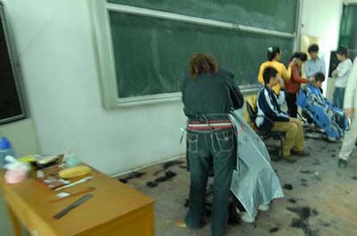 記者來到該校多媒體教室時,看見理發師正在給學生理發,幾名男生坐在椅子上扭動著身體,露出極不情愿的表情。一會兒,幾名男生陸續剪好頭發,每人交了3塊錢走出教室。