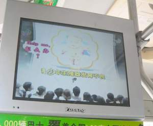 6日上午10時20分,記者在龍昆南路海師大門口處的車站登上了42路公交車。此時,設在司機后座上方的一個顯示器里,正滾動播出視頻廣告。廣告的內容有電影廣告,食品廣告等。