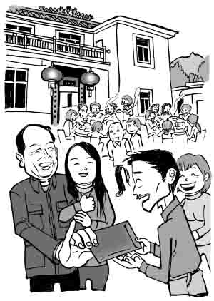 “干爹”身材敦厚壯實,笑盈盈遞過一只紅包:“恭喜恭喜!這是我的見面禮,一點小心意,拿不出手,請你們收下!”