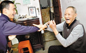 可能是被記者的誠意打動,郭老終于同意接受采訪。郭老雙眼炯炯有神,講話時總是面帶微笑,沒有一點武學大師架子。為了證明自己的寶刀未老,郭富握拳垂直“突擊”面前的木桌,只見桌子迅速反彈后躍起地面足足一寸之高。