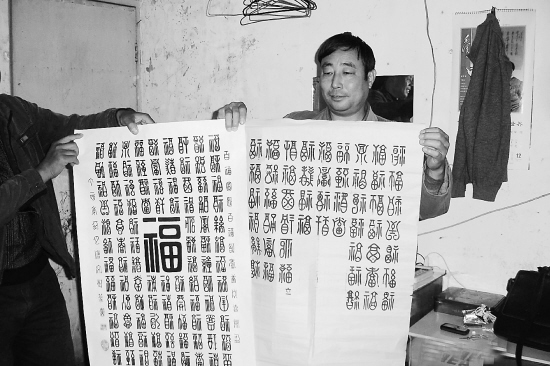 11月25日,傅文博終于完成了一幅自己創作的“百福圖”。如今,他計劃年底前完成楊盛渠生前遺留下來的半幅“百福圖”和兩幅“百壽圖”,并打算把這三幅字畫與楊盛渠遺作一起放在黃巖“孔園”中展覽。(林麗麗 吳中平)
