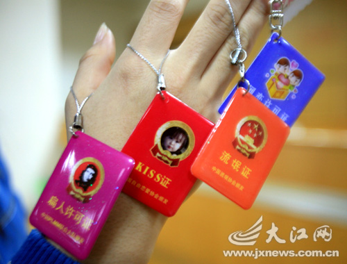 證件,人們日常生活中最平常也最不可或缺的用品,如今被網絡惡搞之風席卷:“戀愛證”、“帥哥證”、“結婚證”、“處女證”等令人啼笑皆非的“惡搞證件”層出不窮。很多學生將它們掛在手機、鑰匙或背包上,將之視為一種新的校園時尚元素。記者發現,被惡搞的紅色“結婚證”與真正的結婚證很相似,內頁可以填寫兩個人的姓名,只是封面上印著“中國婚姻聯盟頒發”字樣。在“光棍證”、“流氓證”等證件中,同樣有大量的惡搞內容,有些十分低俗。懷揣著“流氓證”的南昌市某小學三年級學生萬兵(化名)稚氣未脫地對記者說:“我是流氓我怕誰,拿著它多帥啊!”
