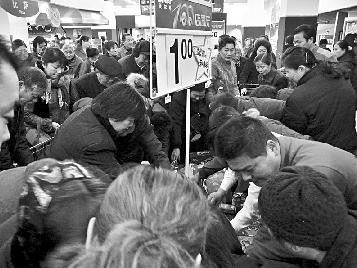 昨天上午8時30分,沃爾瑪洛陽市景華路店開門迎賓,在地下一層大賣場,1元可樂和雪碧成為前來購物市民的首選。老人們蜂擁而上(如圖)。雖然標牌上寫著“每人限購5聽”,但不少老人只顧彎腰往懷里揣,全不顧被踩踏的危險。(記者 楊非)