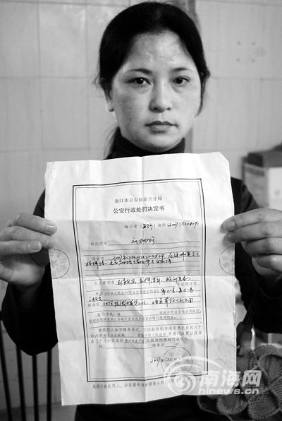 劉女士的“行政處罰決定書”這樣寫著,2007年12月21日22時許,在?诿捞m區板橋路無名麻將館內參與賭博,根據治安管理處罰法規定,對你收繳賭資二十元,治安罰款伍百元。