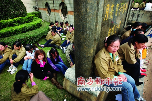昨天,被突然辭退的工人聚集在月亮賀卡(番禺)有限公司門口要求賠償。在新《勞動(dòng)合同法》實(shí)施前夕,月亮賀卡(番禺)有限公司250名員工被通知終止合同不再續(xù)簽,涉及公司管理部、燙金科、印刷科、后勤等10多個(gè)部門。據(jù)悉,被裁掉的大部分是老員工。資方給出的理由是“合同到期”。該公司此舉是否違背了省市有關(guān)部門關(guān)于嚴(yán)管“規(guī)模性裁員”的通知規(guī)定,番禺區(qū)勞動(dòng)監(jiān)察部門等已介入調(diào)查。