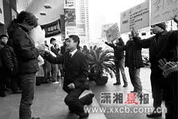 據(jù)其中一名穿著筆挺的深藍色西裝、系著領(lǐng)帶的男子介紹,他叫卓曉勇,張家界人,今年29歲,在長沙五里牌一家公司做事。3年前,通過朋友介紹,他認(rèn)識了女友——中國移動通信小吳門通信店的營業(yè)員郭彩霞,但雙方關(guān)系一直沒有到談婚論嫁的地步,由于父母親催得急,考慮到元旦是一元復(fù)始、萬象更新的日子,他想爭取在新年第一天,贏得芳心,抱得美人歸。