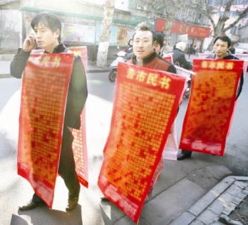 昨日上午,硚口區寶豐二路一居民樓下,5名農民工身披“字書衣”討薪,引來眾多路人圍觀。記者近距離觀察,發現該“字書衣”由兩片長1.5米左右、寬0.5米左右的硬塑料布組成,記述了13名農民工討薪三年以及被人持槍打傷的經過,塑料布上還留有農民工代表及包工頭的聯系方式。