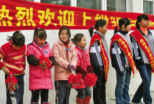 下午2時(shí)50分,捐贈(zèng)單位代表在學(xué)生“熱烈歡迎”聲中來到學(xué)校。幾位代表發(fā)言后,他們逐個(gè)班級(jí)向?qū)W生們贈(zèng)送書包、詞典、筆記本等文具。其中一名代表告訴記者:“本來說好2點(diǎn)鐘來的,后來開會(huì)耽誤了。”