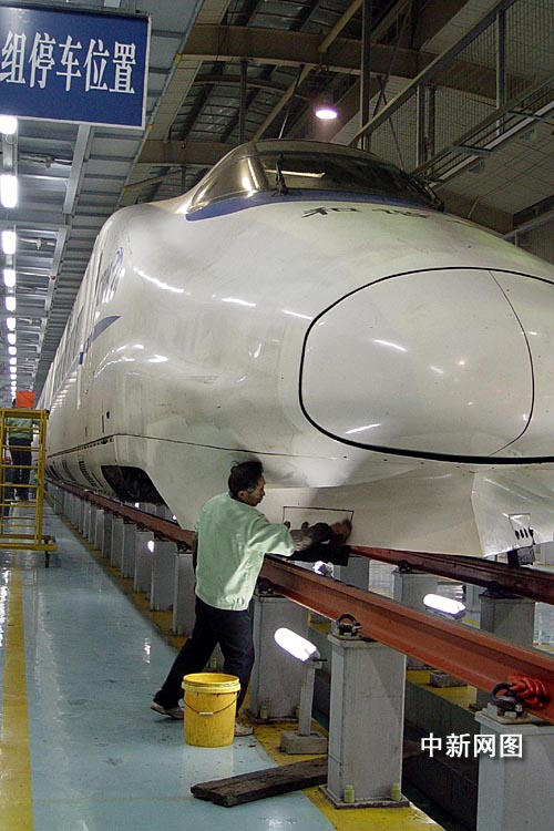 深夜,幾近凌晨。在運(yùn)行了二千余公里后,一列標(biāo)號(hào)為“CRH2—014A”的白色動(dòng)車,此刻像個(gè)大孩子一樣,安詳?shù)靥稍卩嵵菘蛙嚩挝謇锉?dòng)車所檢修庫(kù),等待“體檢”、“洗澡”、“美容”。