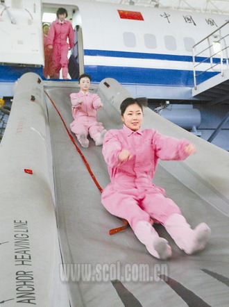 “低下頭,全身緊繃,用力,handsdown,brace。”老師大聲地說著:“你們跟著我一起念,聲音大點!”這是在應急處置艙門的訓練課。五六個學員一邊注意老師的示范動作,一邊在口中大聲地重復著:“低下頭,全身緊繃,用力,handsdown,brace.”嗓子都吼啞了。老師示范完畢之后,她們又一個接一個地在模擬艙中重復著老師的動作。老師一手拿本子,一手拿著計時器,督促她們正確而又快速地完成這些動作,要求十分嚴格,慢了,重來,動作錯了,重來,一直到準確無誤為止。身材玲瓏的劉忍說:“模擬訓練中,老師規定在限制的時間中打開艙門,緊急疏散乘客。艙門十分沉重,我們卻要不斷地按手冊上標準的步驟來打開它。”一天下來,累得腰酸背痛、動彈不得,苦不堪言。