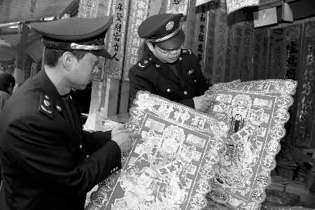 執法人員立即讓該店停止銷售行為,質問其是否知道把人民幣圖樣印在年畫上是違法行為時,店家連說不知道,說年畫上印上人民幣就圖個吉利。在隨后的檢查中,執法人員發現許多年畫上都印有人民幣圖樣,而店家卻無一知曉這是違法行為!拔覀冎皇怯X得吸引客人,大家都圖個財源滾滾,真不知道這是違法的!币患夷戤嫷甑膹埿绽习逭f。