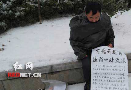 帖子陳述說,“1月29日,長沙的街頭雖然冰雪封凍,但仍然掩蓋不了春節的氣氛,到處呈現出過年的景象。本人剛從超市里購物出來,發現了這令人心酸的一幕,就用攜帶的相機拍了下來。經過筆者簡單的問詢,照片中的人為湖北老河口市(屬襄樊市)的一公園游樂設施承包人,因為三證俱全的房產被政府有關部門定性為違章建筑,而拒絕賠付,并對其所屬的房屋進行強制拆遷,使其公道無處伸張,而流落街頭。”