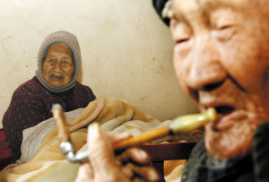 如今,照顧兩人的重擔落到60余歲的兒媳身上,他們的兒子10余年前就去世了。天冷,兒媳就給他們弄了一盆火放進屋里,老人坐在火盆旁,時而抽一口旱煙,再喝一口茶水,神情安詳。而他的老伴,一直不離被窩。