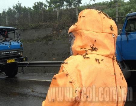 昨日上午,一輛攀枝花車牌的5噸加長大貨車,滿載150余箱(每箱5公斤約2萬余只)蜜蜂,途經(jīng)成渝高速146.5公里處時,后右輪突然飛出車身,貨車側(cè)翻于公路上。車上脫箱而出的上百萬只蜜蜂,瞬時將成渝高速上空變成蜜蜂的海洋。事發(fā)后,交警、高交執(zhí)法隊,以及資中消防官兵10余人聯(lián)手奮戰(zhàn)5個多小時,中午1時30分,成渝高速得以恢復(fù)暢通。
