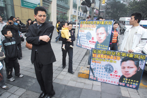 昨日下午2時許,記者在解放碑步行街看到西裝革履的毛杰東以及他的三個“征友牌牌”,征友牌約1米長、70厘米寬,上面印著毛杰東的大頭像,一旁寫著“中國搖滾領袖毛杰東——全國巡回征友第四站重慶站征友:范冰冰的外形、徐靜蕾的才華、林志玲的可愛、楊慧妍的財富、一千萬到一億的資產”等字樣。三名男青年舉著牌子在步行街游走,毛杰東則洋洋得意地走在最前面指揮。數百市民圍觀。