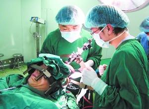 3月21日上午,醫(yī)生給陳先生戴上一個球形坐標(biāo)定位框,通過探測患者的腦電波,在專業(yè)儀器上給患者的大腦建立一個三維矩陣,“就像衛(wèi)星導(dǎo)航定位一樣,人腦中的每一個部位就都具有了一個明確的坐標(biāo)”。之后,醫(yī)生又對患者的大腦進行薄層高清晰度掃描,進一步顯示患者腦內(nèi)的各種結(jié)構(gòu)。然后利用這種掃描的圖像,根據(jù)醫(yī)生的臨床經(jīng)驗,從解剖結(jié)構(gòu)上確認患者大腦內(nèi)需要安放電極核塊的靶點坐標(biāo)。
