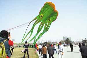 “開始放飛!”“章魚”緩緩抬起了頭。第一次試飛,風(fēng)向突轉(zhuǎn),章魚在空中轉(zhuǎn)了個(gè)個(gè)兒,落在了地上,把一個(gè)看熱鬧的老大爺掀了個(gè)跟頭兒。第二次,“章魚”掛在了樹上。第三次,“章魚”終于升上了天空。
