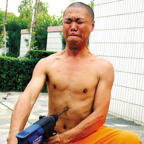 接著,胡瓊又表演沖擊鉆鉆人體。他先用通上電的沖擊鉆鉆木頭和花崗石。木石都被擊穿。然后,胡師傅把腰帶扎得更緊,扎馬下腰、氣沉丹田,大喝一聲,用雙手把高速運(yùn)轉(zhuǎn)的沖擊鉆鉆向肚皮。臺(tái)下觀眾們屏住呼吸,有人蒙住雙眼不敢看。咝咝作響的沖擊鉆在胡師傅的肚皮上打轉(zhuǎn)一分鐘后,胡師傅取下沖擊鉆,肚皮竟絲毫無損。隨后,胡師傅還表演了用沖擊鉆鉆太陽穴。表演結(jié)束后,胡師傅告訴記者,他表演的電鉆鉆人體,就是民間傳說的“金鐘鐵布衫”功夫。