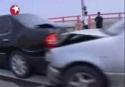 從慈溪往海鹽的大橋上,發生十車連環相撞事故。(東方衛視截圖)