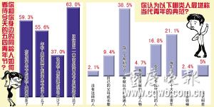 對“過青年節”,32.7%的人抱無所謂的態度,32.6%的人表示不喜歡過青年節,他們認為這個節日只是停留在名義上的傳統節日,諸如講座、演講之類的紀念活動毫無吸引力。
