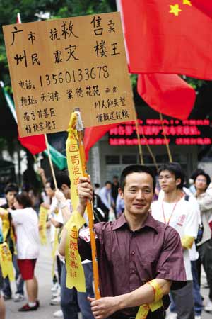 昨日,有一個人,隨著號召募捐行動的志愿者隊伍,從正佳廣場西北門的活動現場一直跟到另一主會場僑鑫教育大院。他始終默默站著,沒和任何人說話;而他手上,則舉著一塊自己制作的簡陋牌子,上面寫著“廣州市民抗震救災售賣樓王”,引來好多路人觀望。