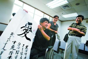 記者了解到,吳華林斷腿前在北京從事服裝生意。斷腿后,他無法再從事任何工作,于是開始用練字來打發時間。“我以前從沒練過毛筆字,這兩年才開始練,你看,這是我寫的‘愛’字。”吳華林邊說,邊從放在輪椅上的包內拿出一幅字讓記者看。目前,吳華林在北京街頭以賣字為生,每幅字讓購買者隨意出錢,“有的給5塊錢,有的給10塊或20塊”。聽完終審判決后,他還專門把寫有“謝謝”的一幅字送給法官。