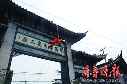 就在此時(shí),消防員飛身?yè)淞松先ィ瑢⒃撆颖ё S捎谶@名女子拼命掙扎,二人雙雙從門樓上掉了下來(lái),幸虧消防員身上的繩子才使兩人懸在半空中。