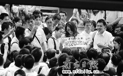 昨日(7月8號)下午2時許,一身著粉紅色衣服、戴太陽鏡、穿黑色網狀絲襪的摩登女郎現身深圳福田區華強北曼哈購物廣場前,脫掉上衣,只留下黑色內衣,手舉“徐滇慶再道歉,因賭房價教授徐滇慶僅在某報刊登半版道歉廣告引起部分市民不滿,身為徐老粉絲,本人獻玉體做版,為其追補道歉,以求對其諒解!”的牌子引來眾多路人圍觀、議論。
