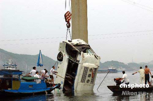 2008年7月12日,湖北宜昌市發生車輛撞破橋梁護欄墜河事故,目前已造成5人死亡,4名失蹤者正在尋找中。中新社發 方佩 攝