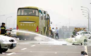 昨天下午4時,記者趕到事發現場,看到大巴車停在第二車道,車子后部地下有兩三個破裂的白色油桶,地上淌著許多綠色液體,還在冒著縷縷青煙。大巴兩側車窗已經破碎,車頭的擋風玻璃也已破裂呈蜘蛛網狀掛在車頭,車下有火燒過的黑色痕跡。
