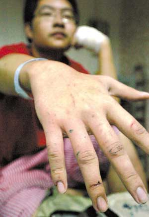 “車子被撞后,司機馬上停車打開車門,我們都往下跑,車里在冒煙,車身外還起了火,坐在中后部來不及跑下車的學生抽出隨車鐵錘擊碎玻璃,從車窗內跳下逃生!狈畢^人民醫院內,一位姓杜的華農學生躺在骨科病床上向記者描述。