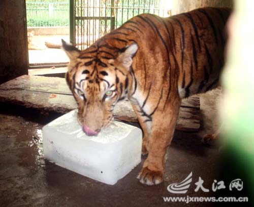 16日,記者在南昌市動物園看到,老虎正抱著大冰塊睡著大覺。“天氣太熱,我們每天都要消耗近600公斤冰塊為5只老虎降溫。3只大象每餐也要吃掉約75公斤西瓜。”飼養員告訴記者。記者看到,河馬喜歡泡在水池里,熊貓則躲在空調房里愜意地打著盹,大象、斑馬忙著啃西瓜。