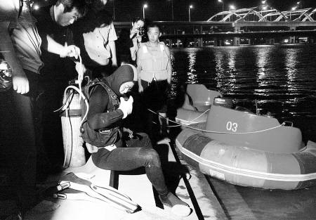 潛水員穿好潛水衣準備下水搜尋溺水者。 記者 劉珂 實習生 洪堅鵬 作